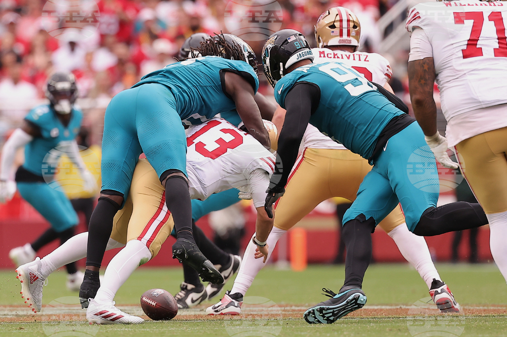 San Francisco 49ers quarterback Brock Purdy (13) fumbles the ball while being hit, which was recovered by the Jacksonville Jaguars, during the second half of an NFL football game in Santa Clara, Calif., Sunday, Sept. 28, 2025. (AP Photo/Kelley L. Cox)