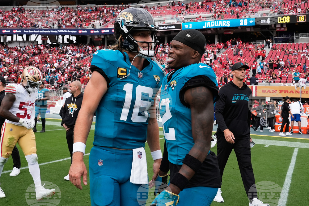 Jacksonville Jaguars quarterback Trevor Lawrence (16) celebrates after running back Travis Etienne Jr. scored against the San Francisco 49ers during the first half of an NFL football game in Santa Clara, Calif., Sunday, Sept. 28, 2025. (AP Photo/Kelley L. Cox)