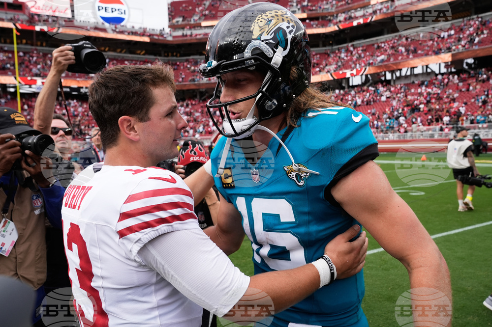 Jacksonville Jaguars quarterback Trevor Lawrence passes against the San Francisco 49ers during the second half of an NFL football game in Santa Clara, Calif., Sunday, Sept. 28, 2025. (AP Photo/Godofredo A. Vásquez)