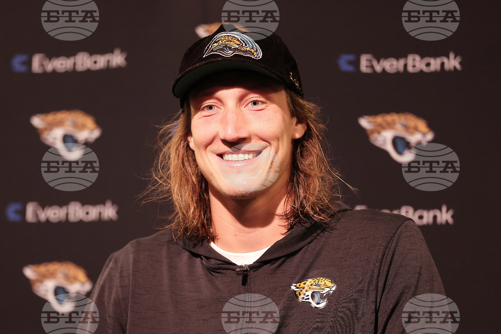 Jacksonville Jaguars quarterback Trevor Lawrence smiles at a news conference after an NFL football game against the San Francisco 49ers in Santa Clara, Calif., Sunday, Sept. 28, 2025. (AP Photo/Kelley L. Cox)