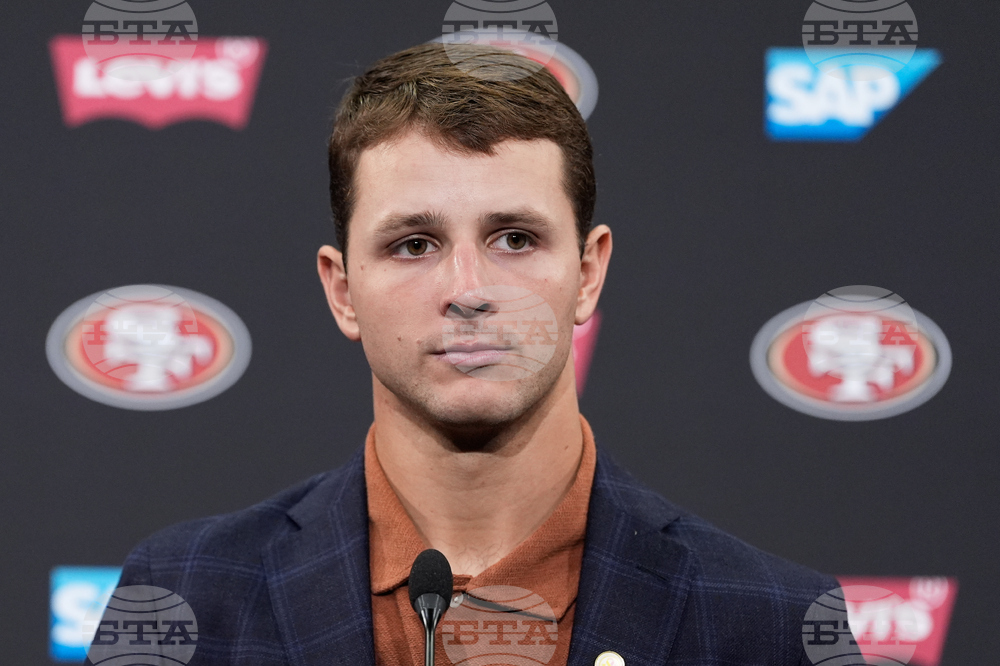 San Francisco 49ers quarterback Brock Purdy speaks at a news conference after an NFL football game against the Jacksonville Jaguars in Santa Clara, Calif., Sunday, Sept. 28, 2025. (AP Photo/Godofredo A. Vásquez)