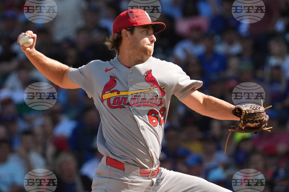 St. Louis Cardinals starting pitcher Kyle Leahy throws against the Chicago Cubs during the third inning of a baseball game in Chicago, Sunday, Sept. 28, 2025. (AP Photo/Nam Y. Huh)