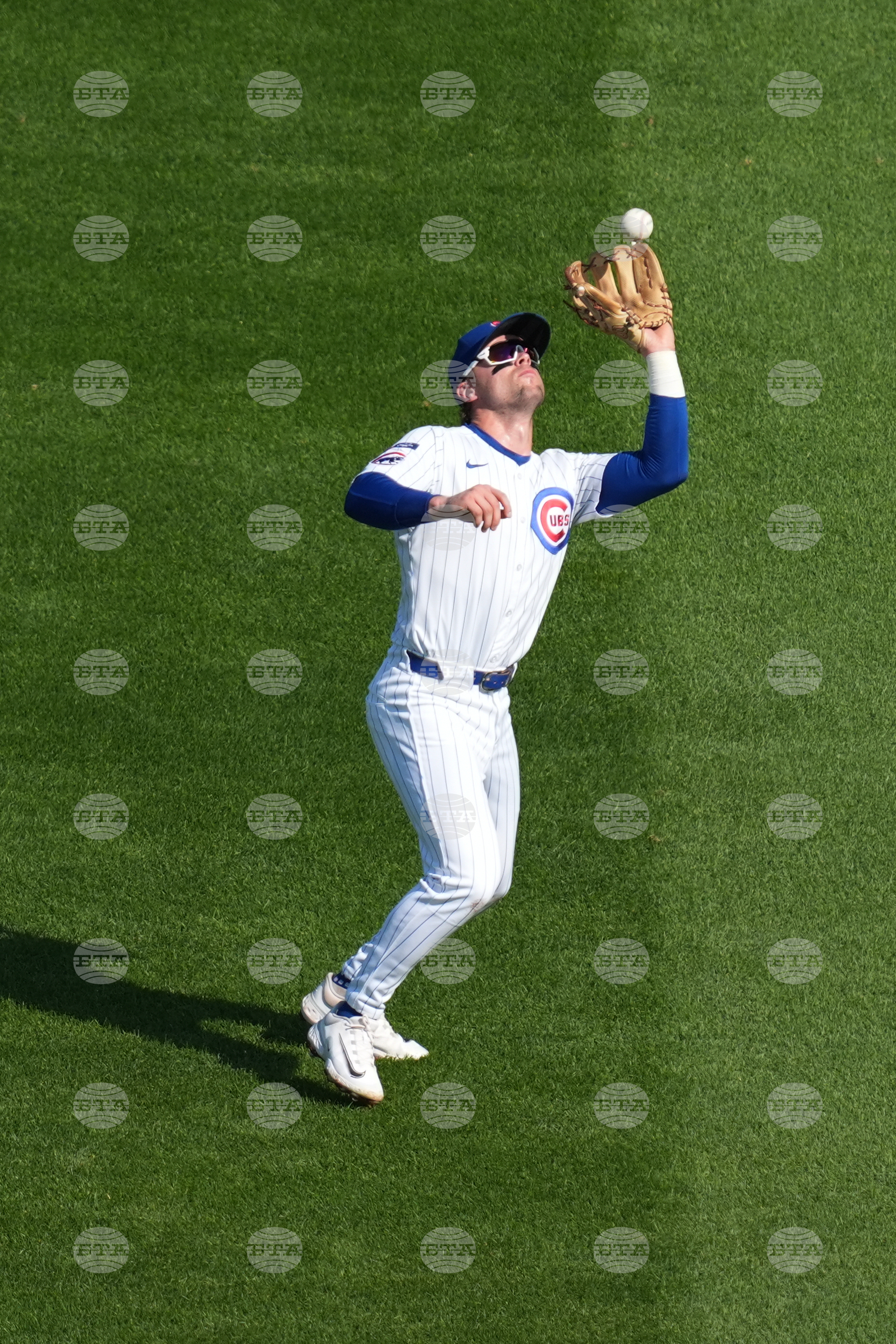 Chicago Cubs second baseman Nico Hoerner catches a fly ball hit by St. Louis Cardinals' Yohel Pozo during the second inning of a baseball game in Chicago, Sunday, Sept. 28, 2025. (AP Photo/Nam Y. Huh)