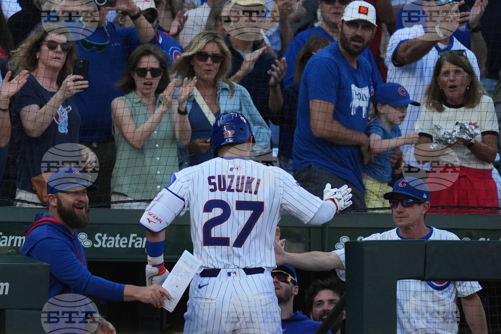 Chicago Cubs' Seiya Suzuki (27), of Japan, is congratulated by manager Craig Counsell, right, after hitting a solo home run during the fifth inning of a baseball game against the St. Louis Cardinals in Chicago, Sunday, Sept. 28, 2025. (AP Photo/Nam Y. Huh)