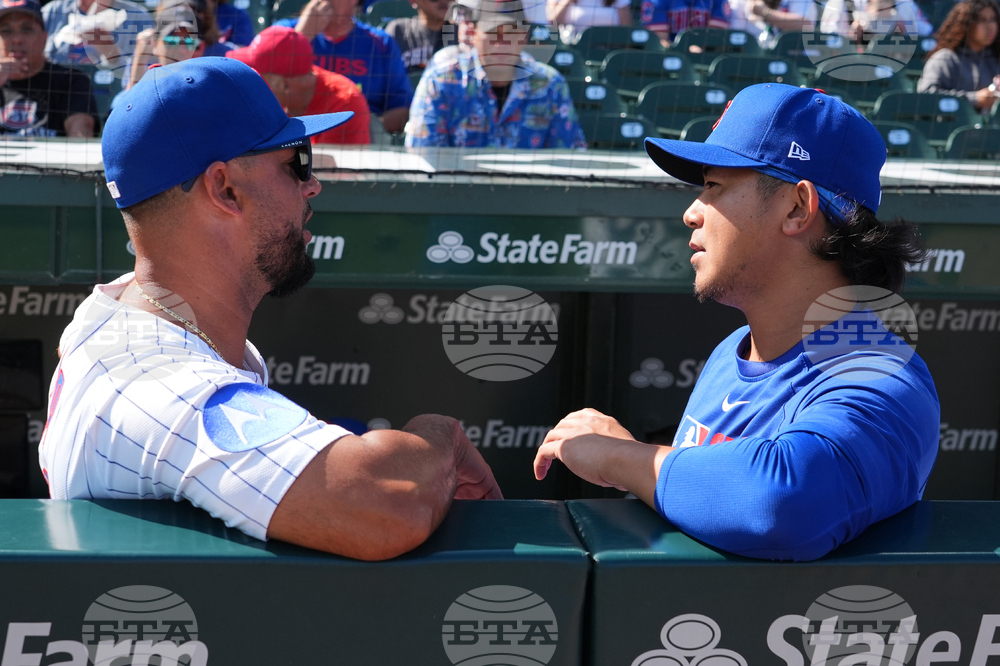 Chicago Cubs pitcher Shota Imanaga, right, of Japan, talks with major league coach Jonathan Mota, left, before a baseball game against the St. Louis Cardinals in Chicago, Sunday, Sept. 28, 2025. (AP Photo/Nam Y. Huh)