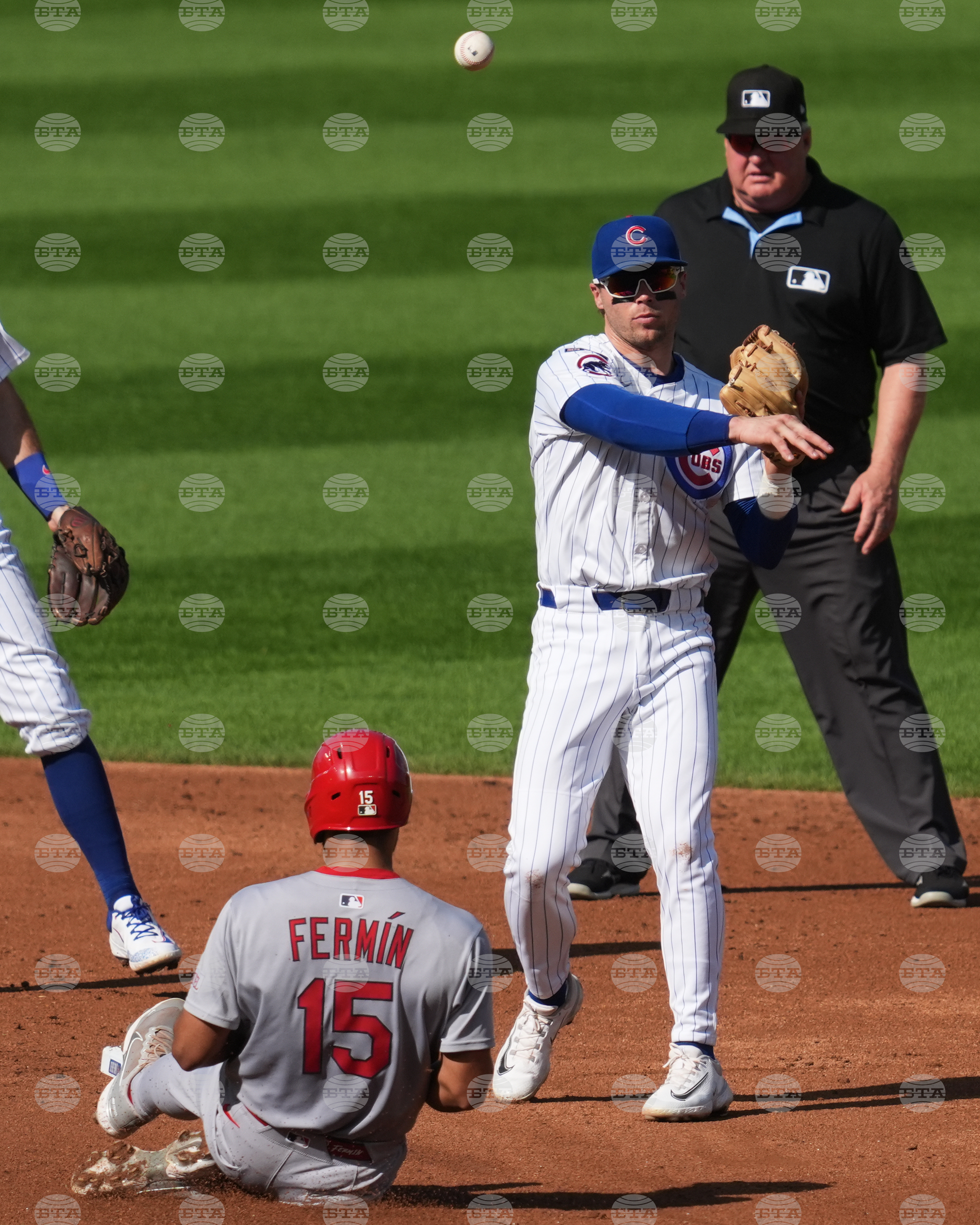 Chicago Cubs second baseman Nico Hoerner, front right, throws out St. Louis Cardinals' Iván Herrera (not shown) at first base after forcing out Cadinals' José Fermín (15) during the third inning of a baseball game in Chicago, Sunday, Sept. 28, 2025. (AP Photo/Nam Y. Huh)