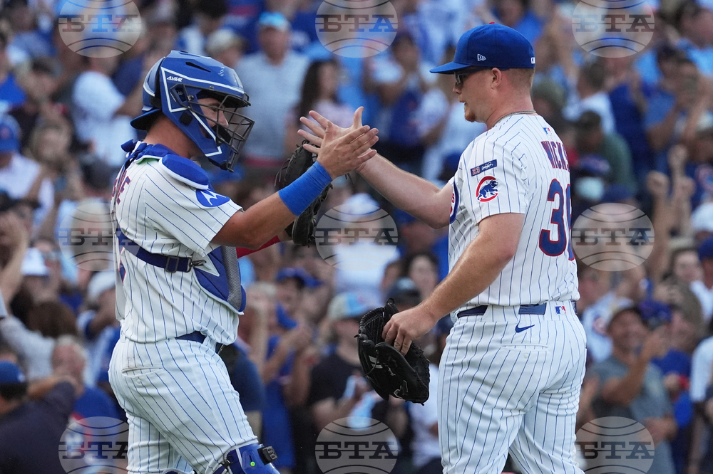Chicago Cubs catcher Reese McGuire, left, celebrates with relief pitcher Jordan Wicks, right, after their team defeated the St. Louis Cardinals in a baseball game in Chicago, Sunday, Sept. 28, 2025. (AP Photo/Nam Y. Huh)