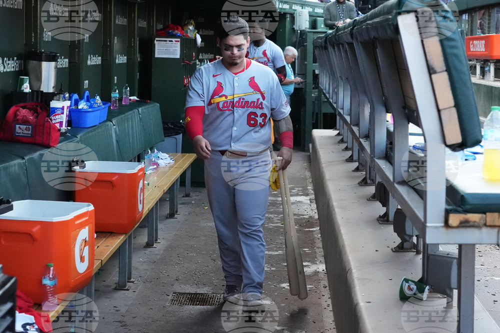 St. Louis Cardinals' Yohel Pozo looks down as he leaves after his team's loss in a baseball game against the Chicago Cubs in Chicago, Sunday, Sept. 28, 2025. (AP Photo/Nam Y. Huh)