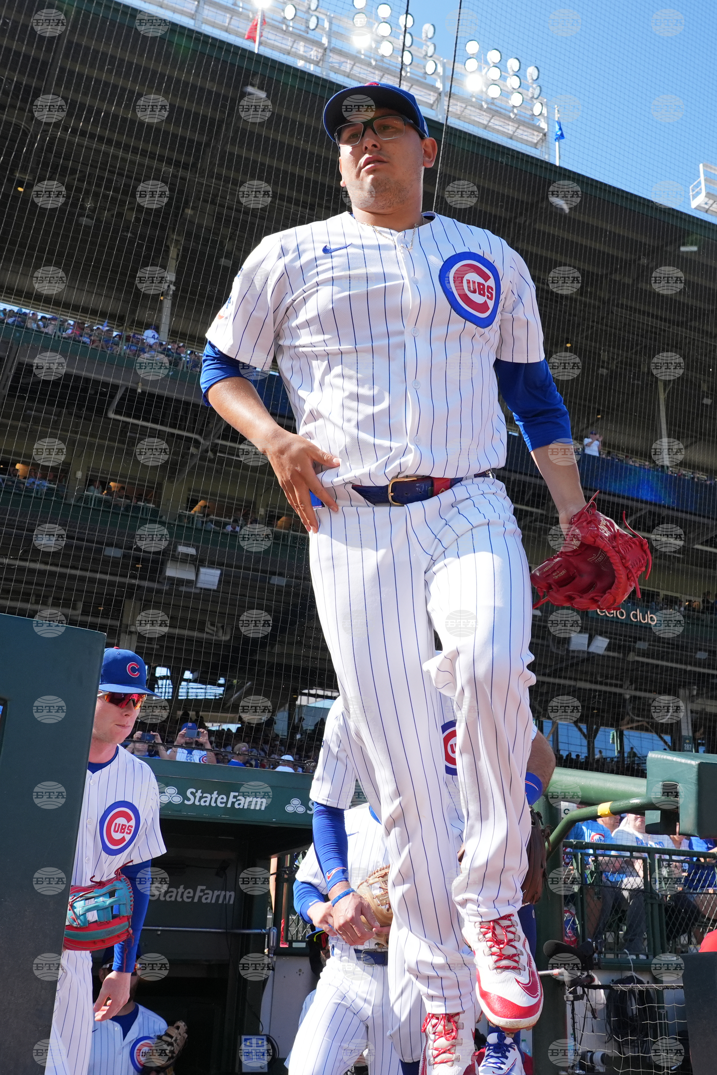 Chicago Cubs starting pitcher Javier Assad runs to the field before the first inning of a baseball game against the St. Louis Cardinals in Chicago, Sunday, Sept. 28, 2025. (AP Photo/Nam Y. Huh)