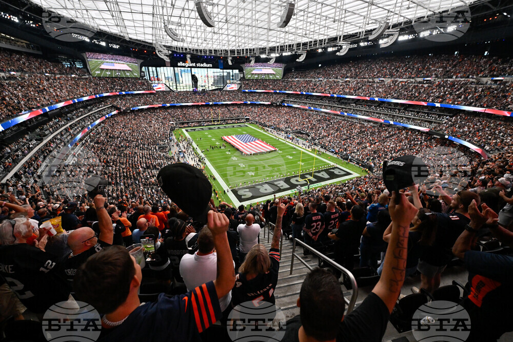 Fans cheer before an NFL football game between the Las Vegas Raiders and the Chicago Bears Sunday, Sept. 28, 2025, in Las Vegas. (AP Photo/David Becker)