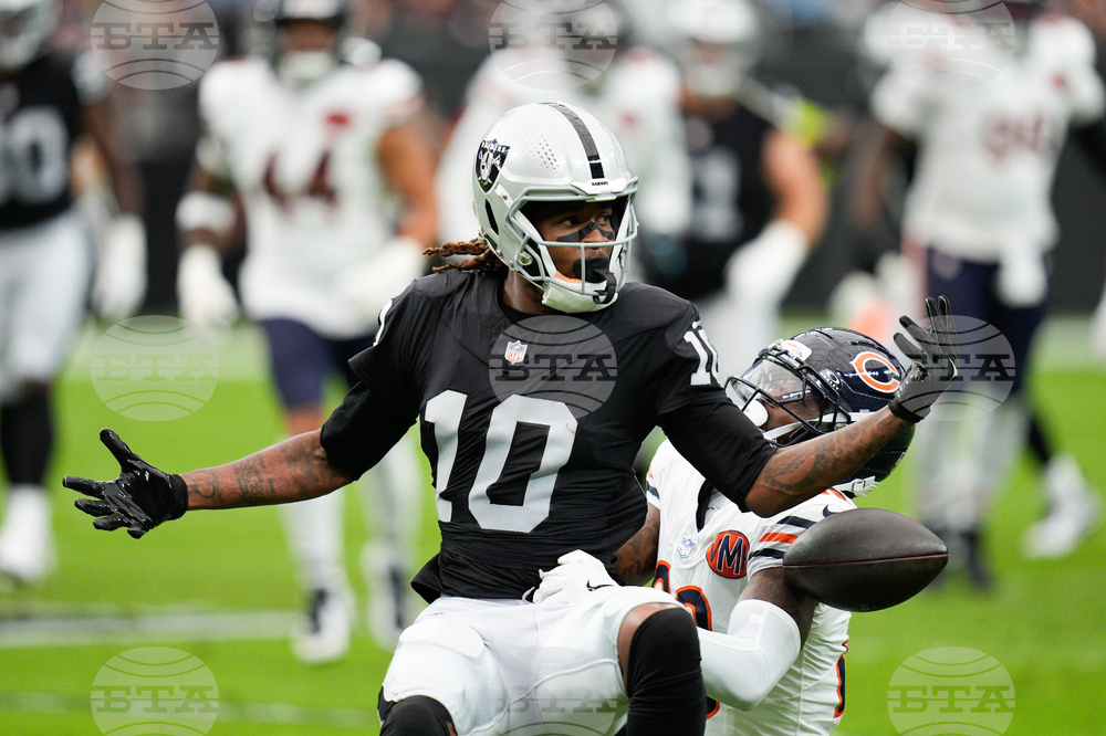 Chicago Bears cornerback Tyrique Stevenson (29) breaks up a pass intended for Las Vegas Raiders wide receiver Dont'E Thornton Jr. (10) during the first half of an NFL football game Sunday, Sept. 28, 2025, in Las Vegas. (AP Photo/John Locher)