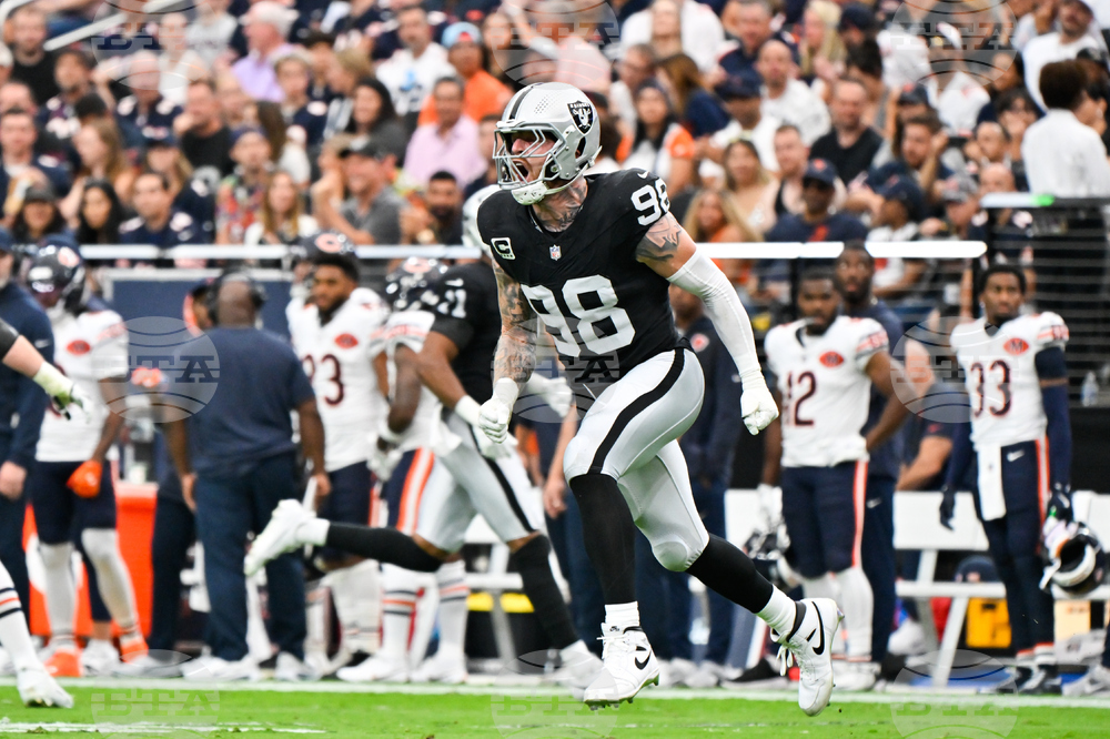 Las Vegas Raiders defensive end Maxx Crosby (98) reacts to a play during the first half of an NFL football game against the Chicago Bears Sunday, Sept. 28, 2025, in Las Vegas. (AP Photo/David Becker)
