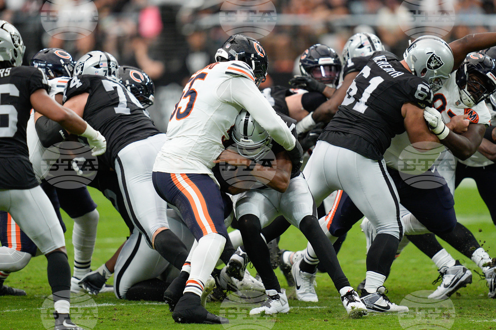 Las Vegas Raiders running back Ashton Jeanty (2) is tackled by Chicago Bears players during the first half of an NFL football game Sunday, Sept. 28, 2025, in Las Vegas. (AP Photo/John Locher)