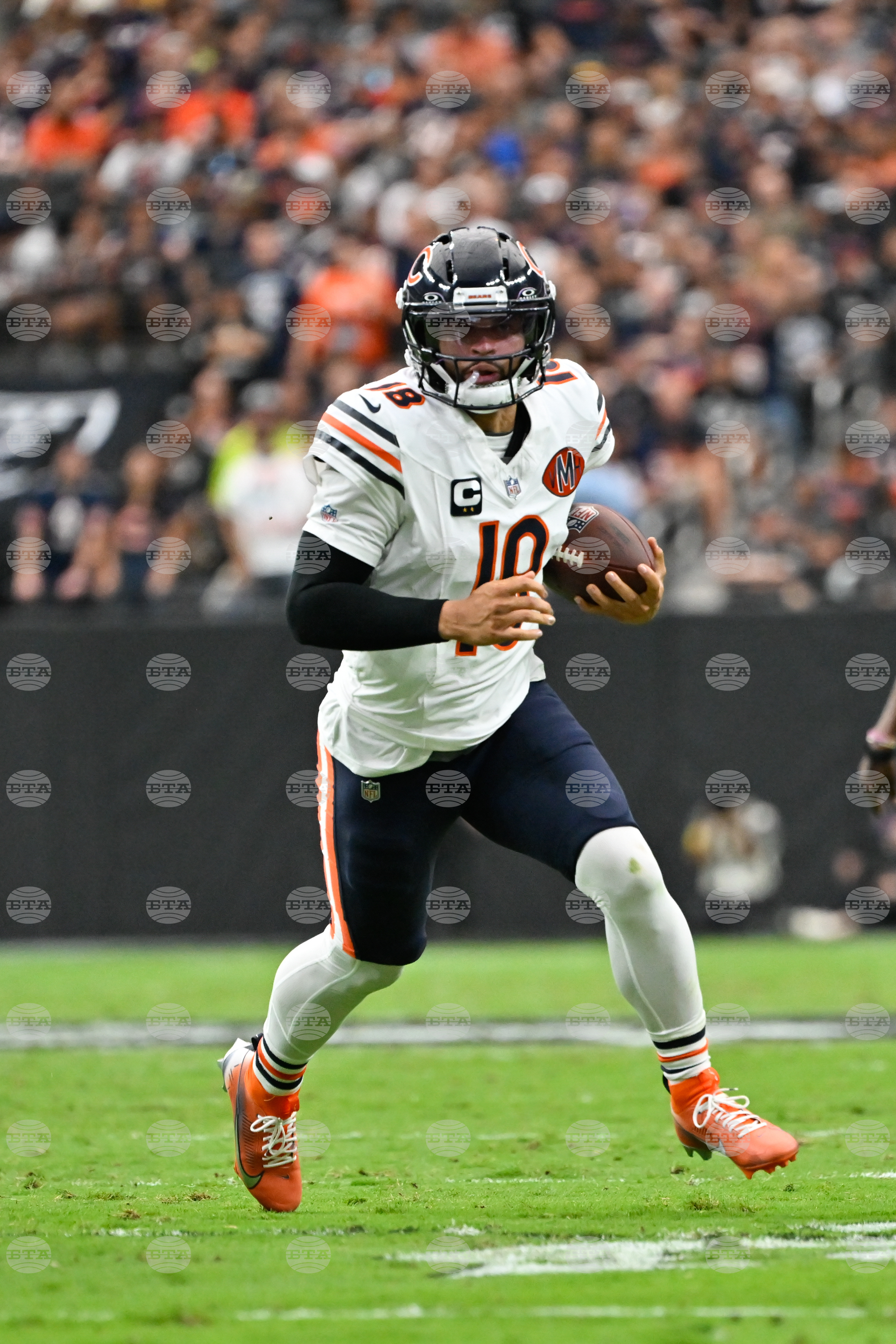 Chicago Bears quarterback Caleb Williams (18) carries the ball against the Las Vegas Raiders during the first half of an NFL football game Sunday, Sept. 28, 2025, in Las Vegas. (AP Photo/David Becker)