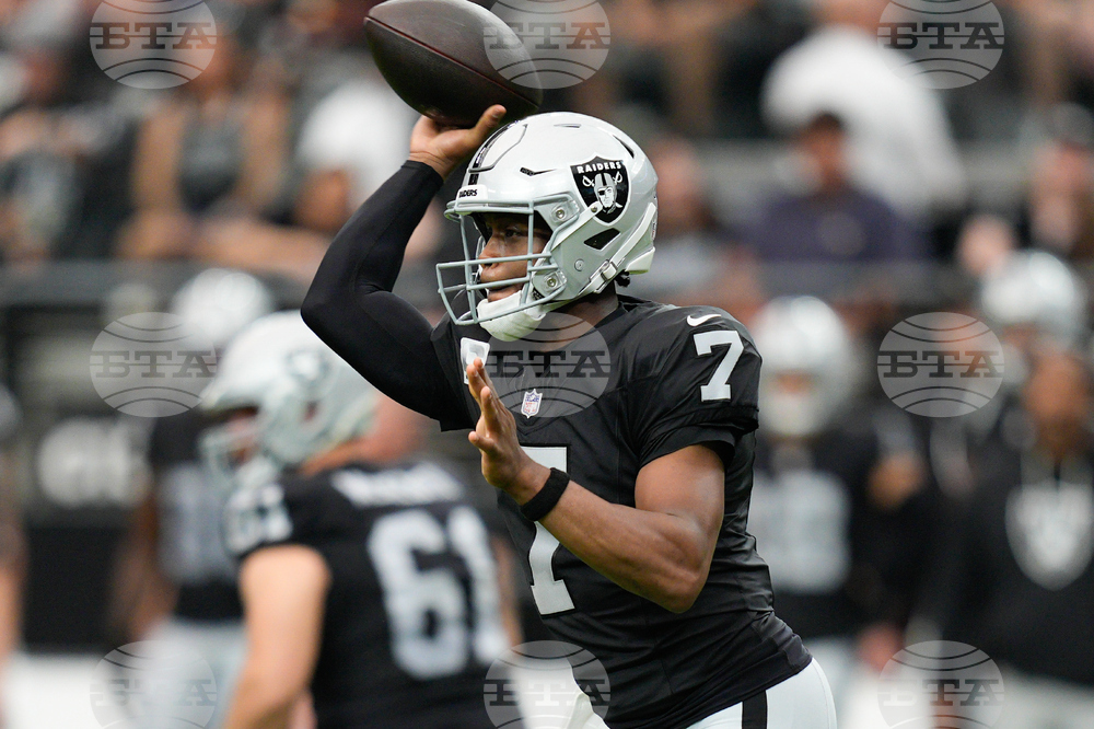 Las Vegas Raiders quarterback Geno Smith (7) throws a pass against the Chicago Bears during the first half of an NFL football game Sunday, Sept. 28, 2025, in Las Vegas. (AP Photo/John Locher)