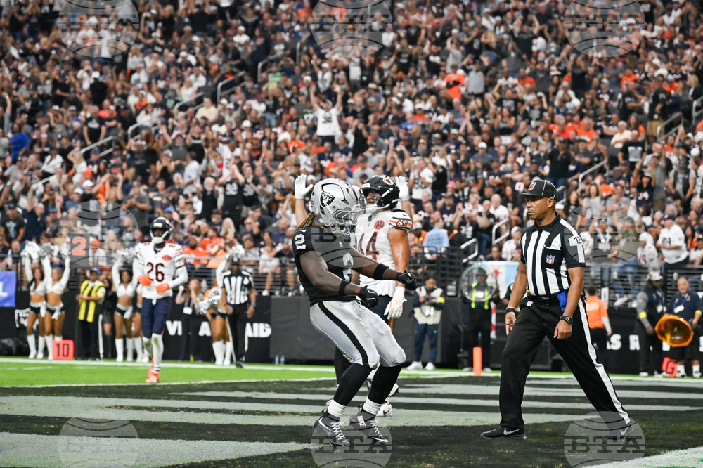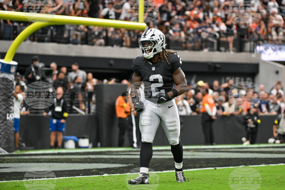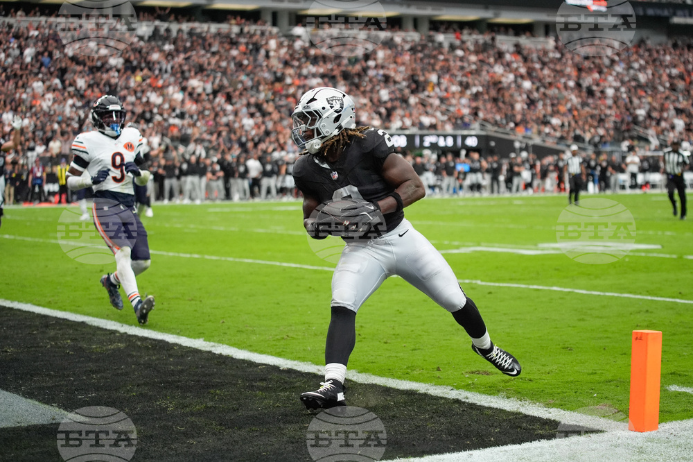Las Vegas Raiders running back Ashton Jeanty (2) scores a touchdown against the Chicago Bears during the first half of an NFL football game Sunday, Sept. 28, 2025, in Las Vegas. (AP Photo/John Locher)