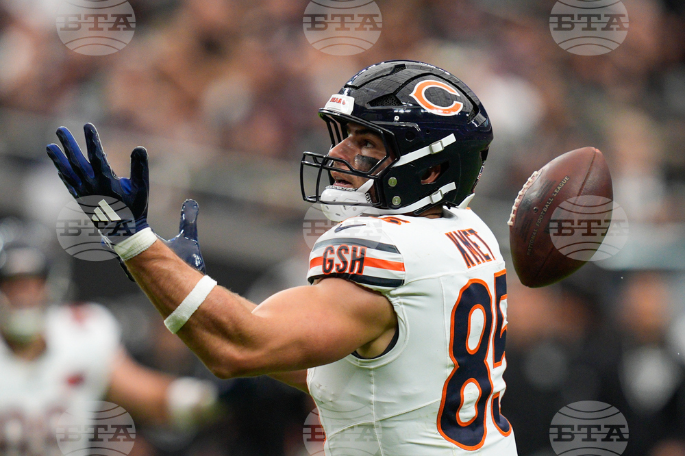 Chicago Bears tight end Cole Kmet (85) misses a pass during the first half of an NFL football game against the Las Vegas Raiders Sunday, Sept. 28, 2025, in Las Vegas. (AP Photo/John Locher)