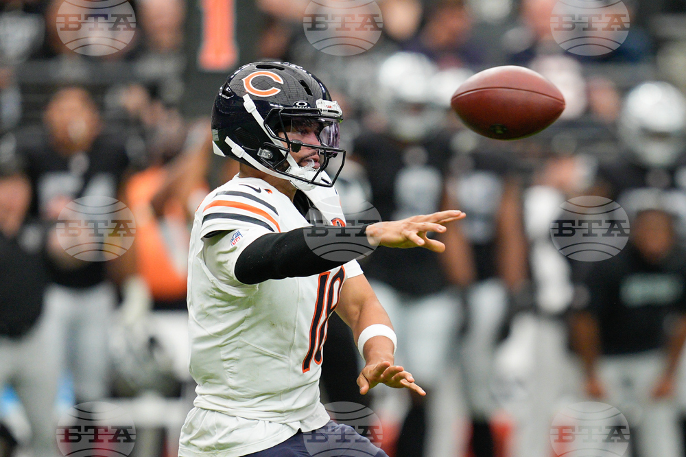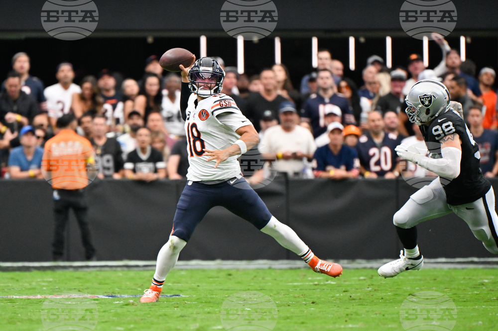 Chicago Bears quarterback Caleb Williams (18) throws a pass during the first half of an NFL football game against the Las Vegas Raiders Sunday, Sept. 28, 2025, in Las Vegas. (AP Photo/John Locher)