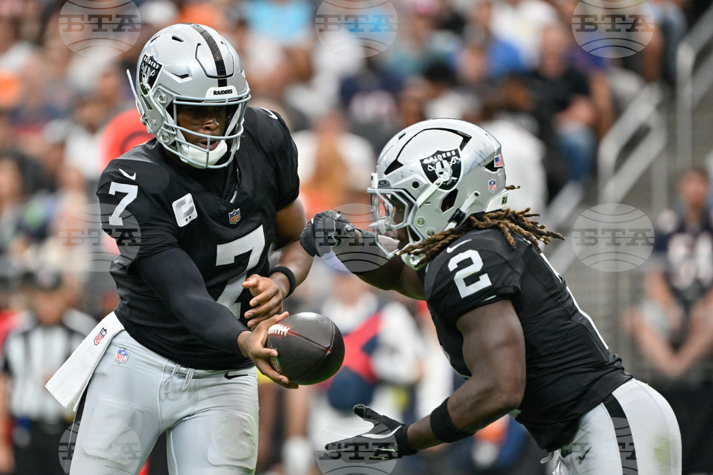 Las Vegas Raiders quarterback Geno Smith (7) hands the ball to running back Ashton Jeanty (2) during the first half of an NFL football game against the Chicago Bears Sunday, Sept. 28, 2025, in Las Vegas. (AP Photo/David Becker)