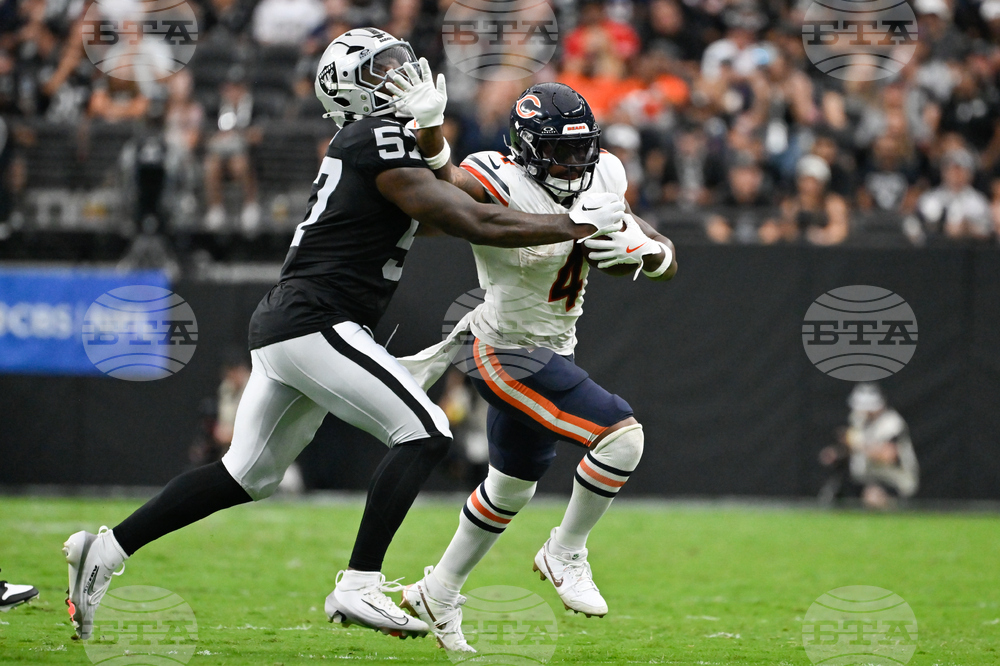 Chicago Bears running back d'Andre Swift (4) pushes away Las Vegas Raiders linebacker Germaine Pratt (57) during the second half of an NFL football game Sunday, Sept. 28, 2025, in Las Vegas. (AP Photo/David Becker)