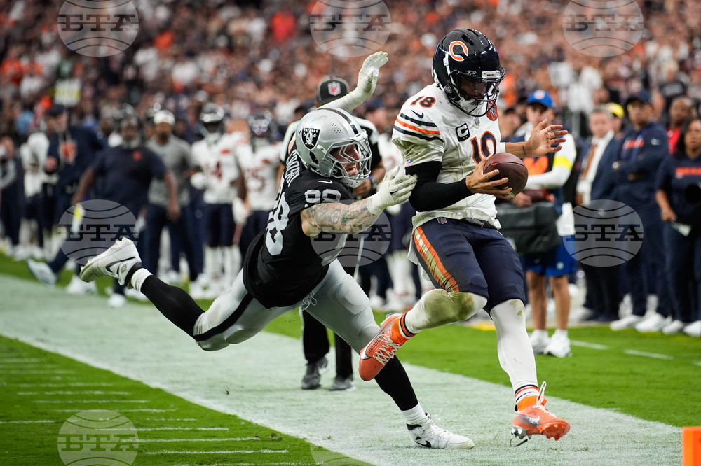 Chicago Bears quarterback Caleb Williams (18) is pushed out of bounds by Las Vegas Raiders defensive end Maxx Crosby (98) during the second half of an NFL game, Sunday, Sept. 28, 2025, in Las Vegas. (AP Photo/John Locher)