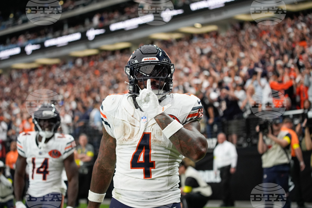 Chicago Bears running back d'Andre Swift (4) celebrates his touchdown during the second half of an NFL football game against the Las Vegas Raiders Sunday, Sept. 28, 2025, in Las Vegas. (AP Photo/John Locher)