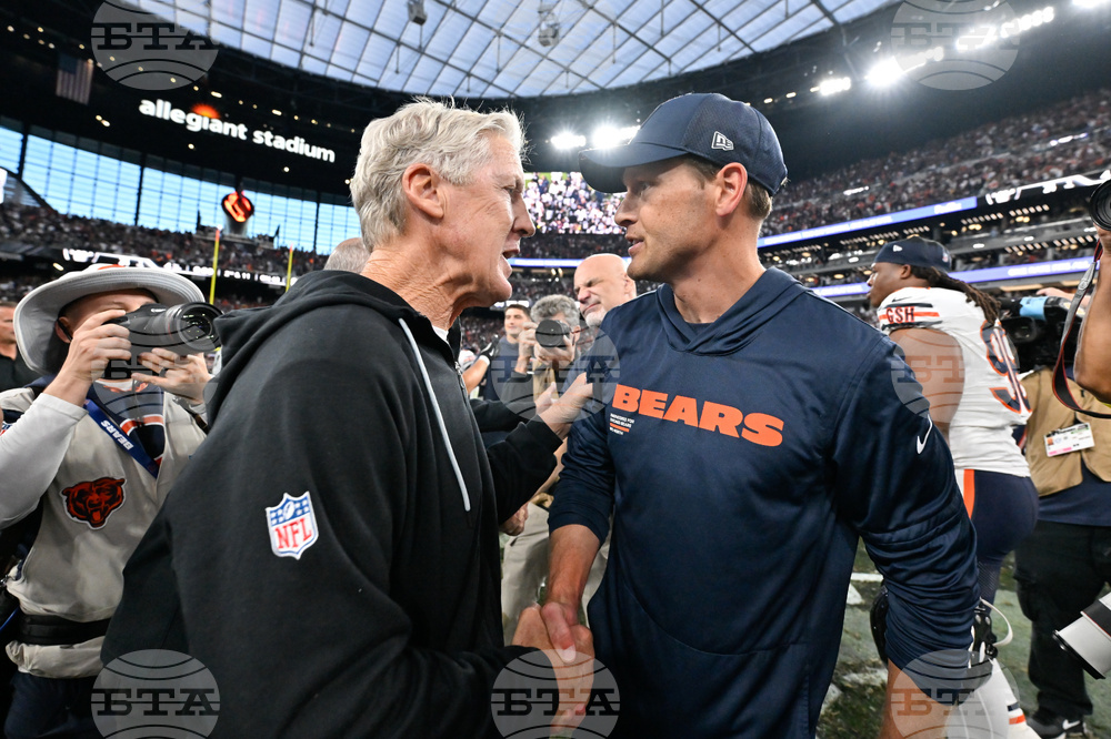 Las Vegas Raiders head coach Pete Carroll, left, and Chicago Bears head coach Ben Johnson shake hands after an NFL football game Sunday, Sept. 28, 2025, in Las Vegas. (AP Photo/David Becker)