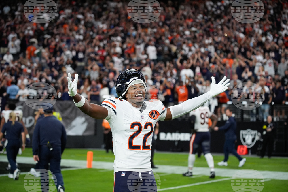 Chicago Bears safety Elijah Hicks (22) celebrates the team's win in an NFL football game against the Las Vegas Raiders Sunday, Sept. 28, 2025, in Las Vegas. (AP Photo/John Locher)