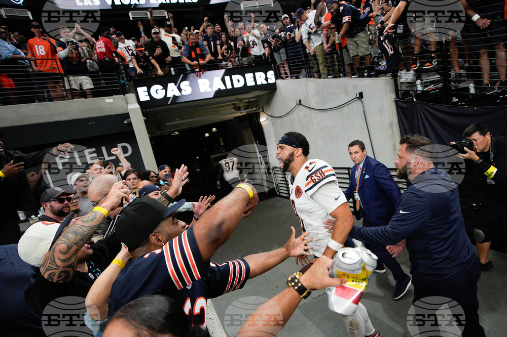 Chicago Bears quarterback Caleb Williams (18) celebrates with the fans after an NFL football game against the Las Vegas Raiders Sunday, Sept. 28, 2025, in Las Vegas. (AP Photo/John Locher)