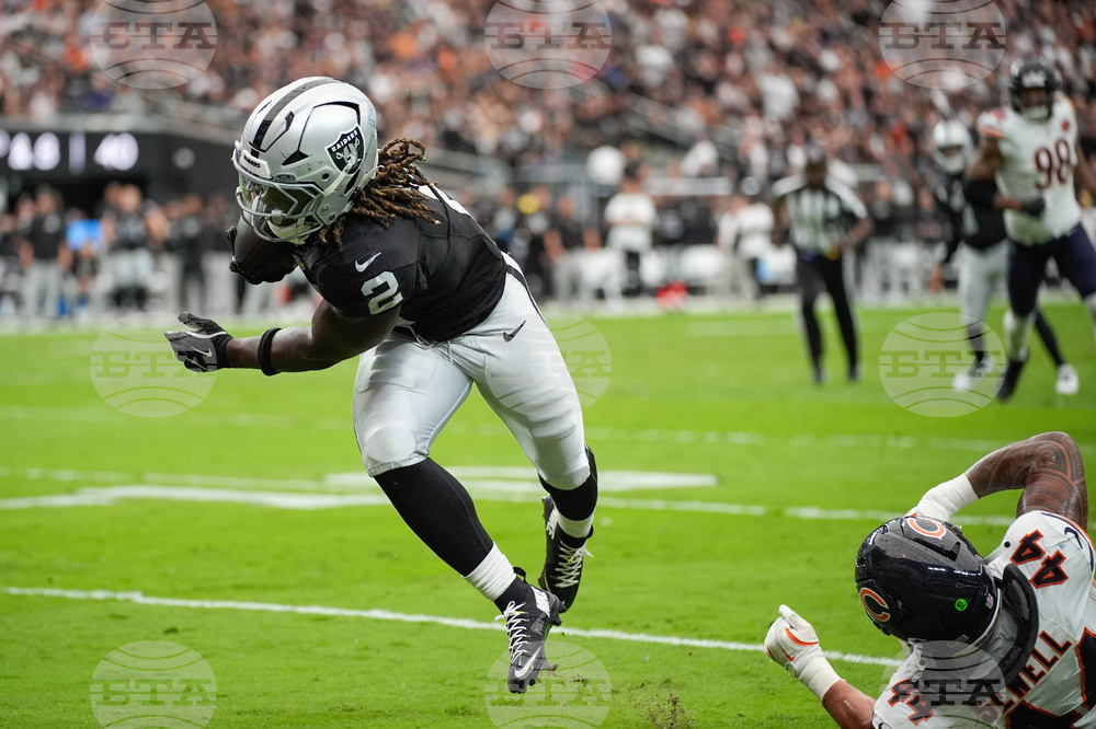 Las Vegas Raiders running back Ashton Jeanty (2) is grabbed by Chicago Bears free safety Kevin Byard (31) as he runs toward the end zone for a touchdown during the first half of an NFL game, Sunday, Sept. 28, 2025, in Las Vegas. (AP Photo/David Becker)