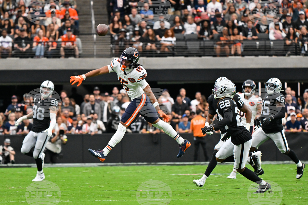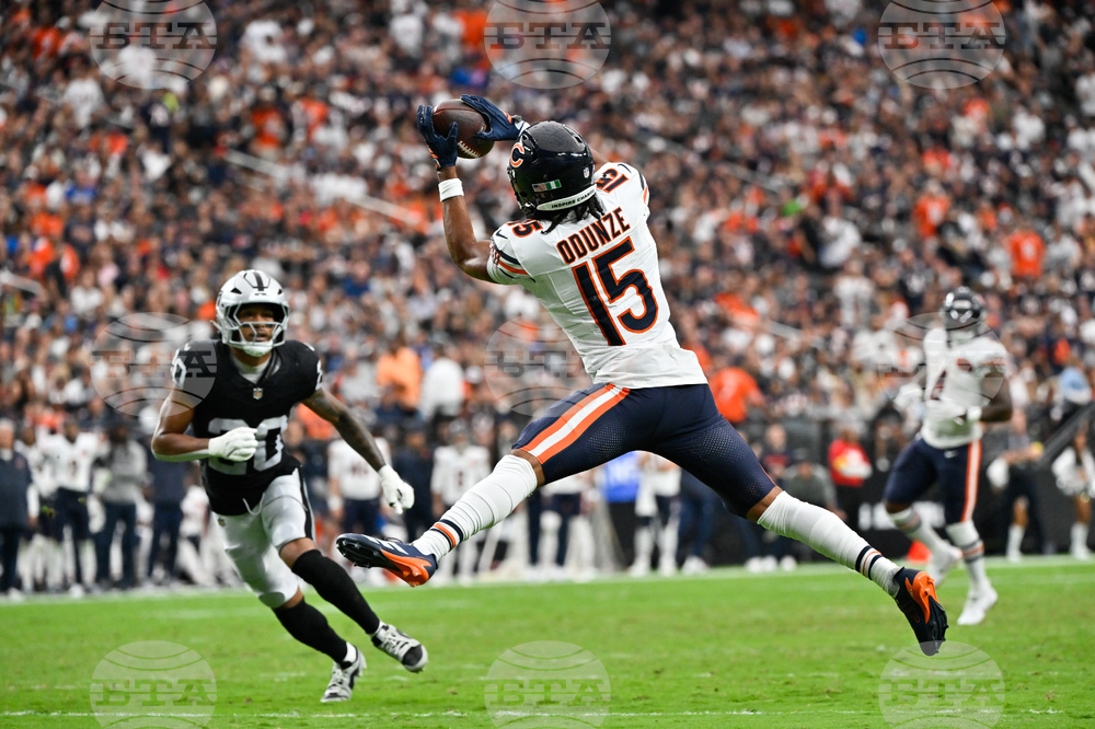 Chicago Bears wide receiver Rome Odunze (15) misses a pass against the Las Vegas Raiders during the first half of an NFL football game Sunday, Sept. 28, 2025, in Las Vegas. (AP Photo/David Becker)