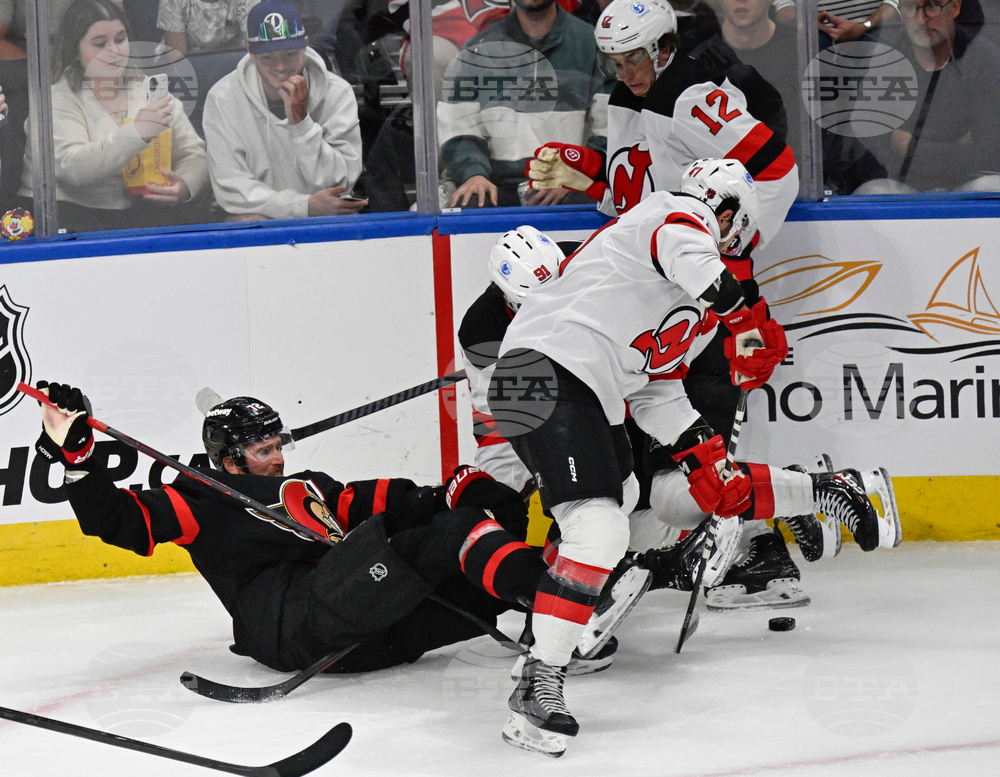 Ottawa Senators' Thomas Chabot, left, falls while fighting for a puck with New Jersey Devils' Cody Glass (12), Paul Cotter (47) and Dawson Mercer (91) during second-period NHL hockey preseason game action in Quebec City, Sunday, Sept. 28, 2025. (Jacques Boissinot/The Canadian Press via AP)