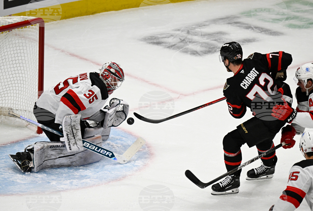 Ottawa Senators' Thomas Chabot (72) shoots against New Jersey Devils goalie Georgi Romanov, left, during first-period NHL hockey preseason game action in Quebec City, Sunday, Sept. 28, 2025. (Jacques Boissinot/The Canadian Press via AP)