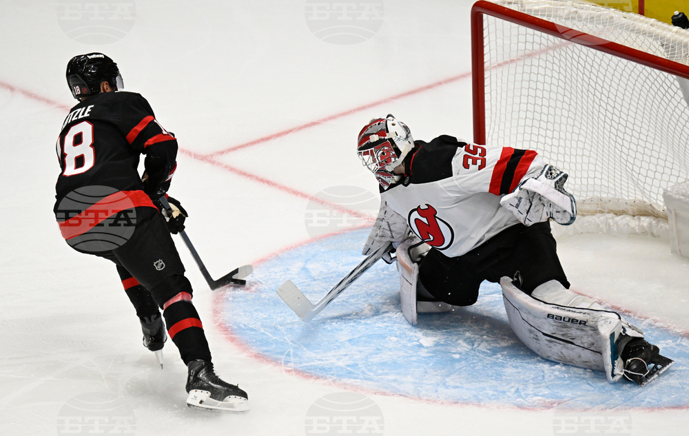 Ottawa Senators Tim Stutzle, left, takes penalty shot as New Jersey Devils goalie Georgi Romanov, right, makes a stop during second-period NHL hockey preseason game action in Quebec City, Sunday, Sept. 28, 2025. (Jacques Boissinot/The Canadian Press via AP)