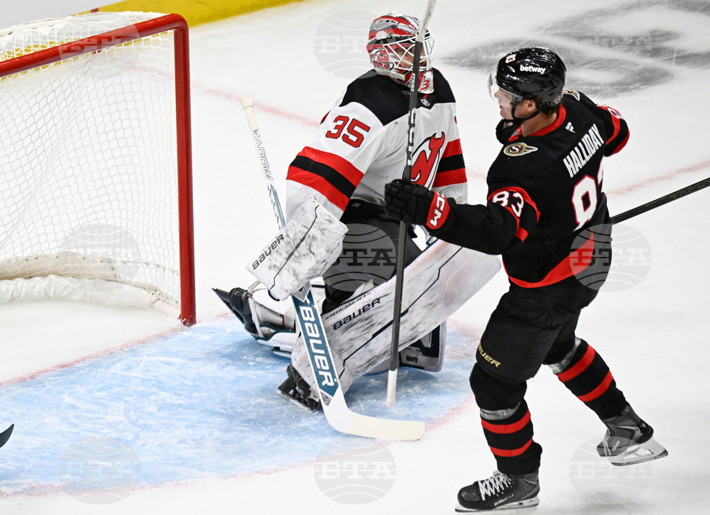 Ottawa Senators Thomas Chabot (72) shoots against New Jersey Devils goalie Georgi Romanov, left, during first-period NHL hockey preseason game action in Quebec City, Sunday, Sept. 28, 2025. (Jacques Boissinot/The Canadian Press via AP)