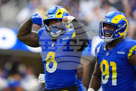 CORRECTS TO RAMS LINEBACKER JARED VERSE (8) NOT COLTS PUNTER RIGOBERTO SANCHEZ - Los Angeles Rams linebacker Jared Verse (8) celebrates with defensive end Kobie Turner (91) after a defensive pressure against the Indianapolis Colts during the second hall of an NFL football game Sunday, Sept. 28, 2025, in Inglewood, Calif. (AP Photo/Marcio Jose Sanchez)