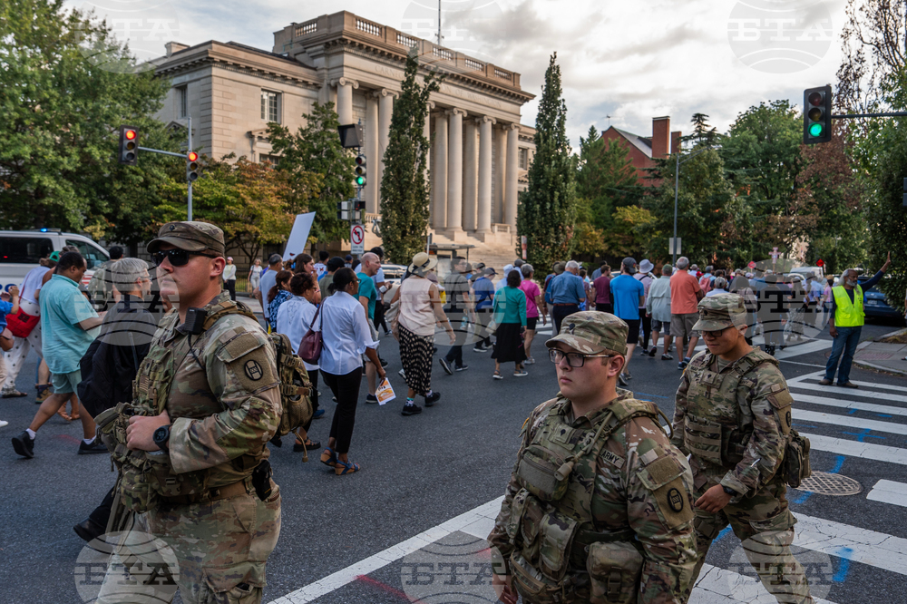 South Carolina national guardsmen pass by as people walk from Shrine of the Sacred Heart to Cathedral of St. Matthew the Apostle during the first reflection procession in observance of the 111th world day of migrants and refugees and the jubilee of migrants, Sunday, Sept. 28, 2025, in Washington. (AP Photo/Julia Demaree Nikhinson)