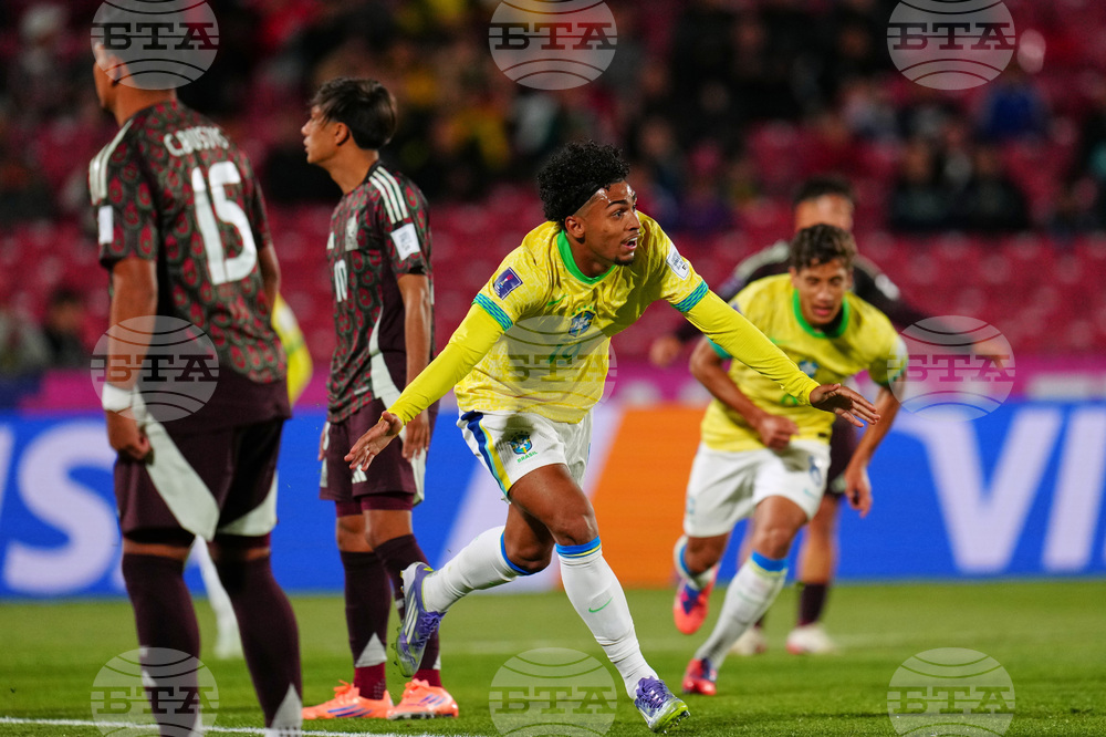 Brazil's Luighi celebrates scoring his side's second goal against Mexico during a FIFA U-20 World Cup Group C soccer match at National Stadium in Santiago, Chile, Sunday, Sept. 28, 2025. (AP Photo/Esteban Felix)