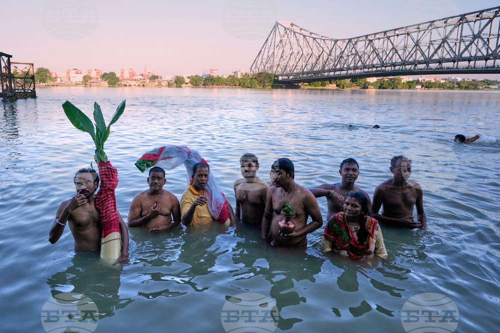 Hindu devotees take a bath with a banana tree near the iconic Howrah Bridge, as part of the ritual on the first day of Durga Puja festival on the banks of the Hooghly River, in Kolkata, India, Monday, Sept. 29, 2025. (AP Photo/Bikas Das)