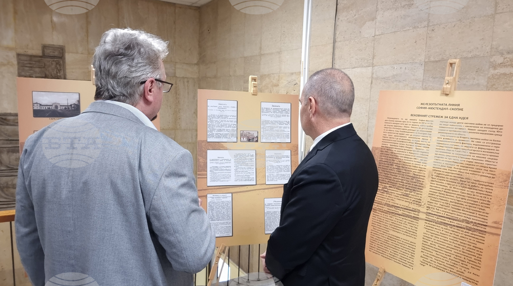 Кюстендил (29 септември 2025) На брифинг в Кюстендил заместник министър-председателят и министър на транспорта и съобщенията Гроздан Караджов обяви, че на четвърти ноември ще бъде подписано споразумение с Република Северна Македония за общия трансграничен тунел, част от Коридор №8 участъците от Коридор №8 от Радомир до Перник и от Перник до София са върнати в инвестиционната програма на Национална компания „Железопътна инфраструктура“, както и че за трасето от Радомир до Гюешево до края на годината ще бъде приет нов проект за почти изцяло ново трасе, по което движението на влаковете ще бъде със скорост до 160 км. ч. На снимката (от ляво надясно): заместник министър-председателят и министър на транспорта и съобщенията Гроздан Караджов и историкът доц. д-р Ангел Джонев.