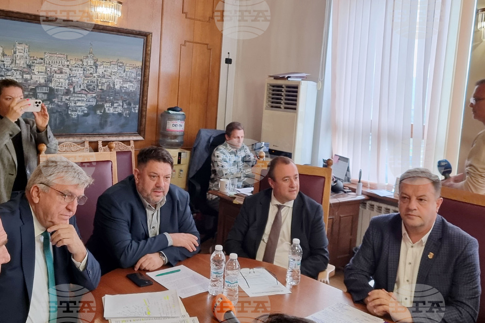 Велико Търново (29 септември 2025) Във връзка със ситуацията около водоподаването в региона и появилите се информации в публичното пространство и социалните мрежи, че във Велико Търново се очаква воден режим се провежда информационна среща по повод намалялото ниво на язовир "Йовковци". На снимката (от ляво надясно): министърът на околната среда и водите Манол Генов, министърът на регионалното развитие и благоустройството Иван Иванов, визепремиерът Атанас Зафиров, кметът на Велико - Търново Даниел Панов и народният представител от ГЕРБ-СДС д-р Костадин Ангелов.