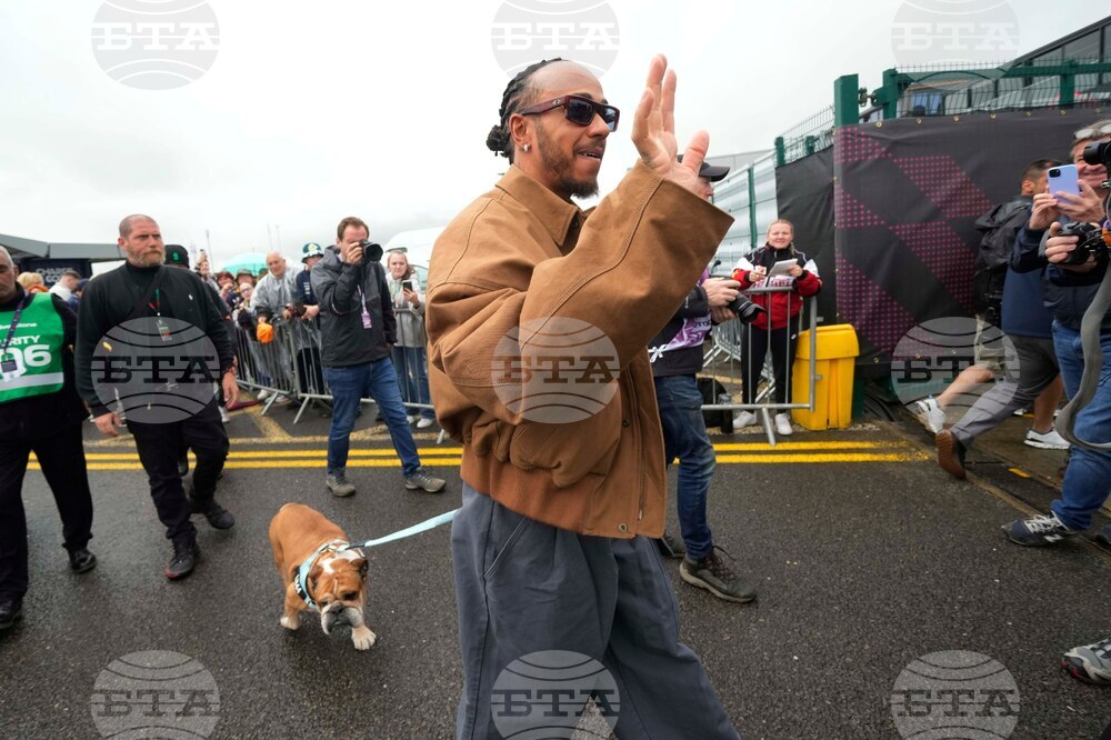 FILE - Mercedes driver Lewis Hamilton of Britain cheers fans as he arrives with his dog Roscoe ahead the first free practice at the Silverstone racetrack, Silverstone, England, Friday, July 5, 2024. (AP Photo/Luca Bruno, File)