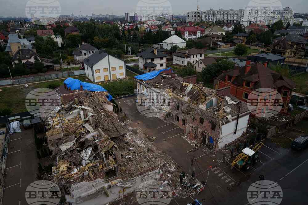 Residential houses are seen destroyed after a Russian strike in Kyiv, Ukraine, on Monday, Sept. 29, 2025. (AP Photo/Evgeniy Maloletka)