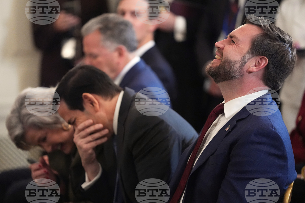 Secretary of State Marco Rubio, center, reacts alongside Vice President JD Vance before President Donald Trump holds a news conference with Israeli Prime Minister Benjamin Netanyahu in the State Dining Room of the White House, Monday, Sept. 29, 2025, in Washington. (AP Photo/Evan Vucci)