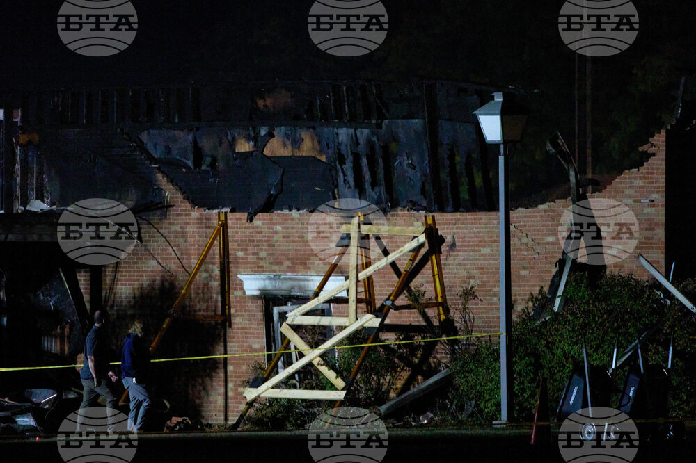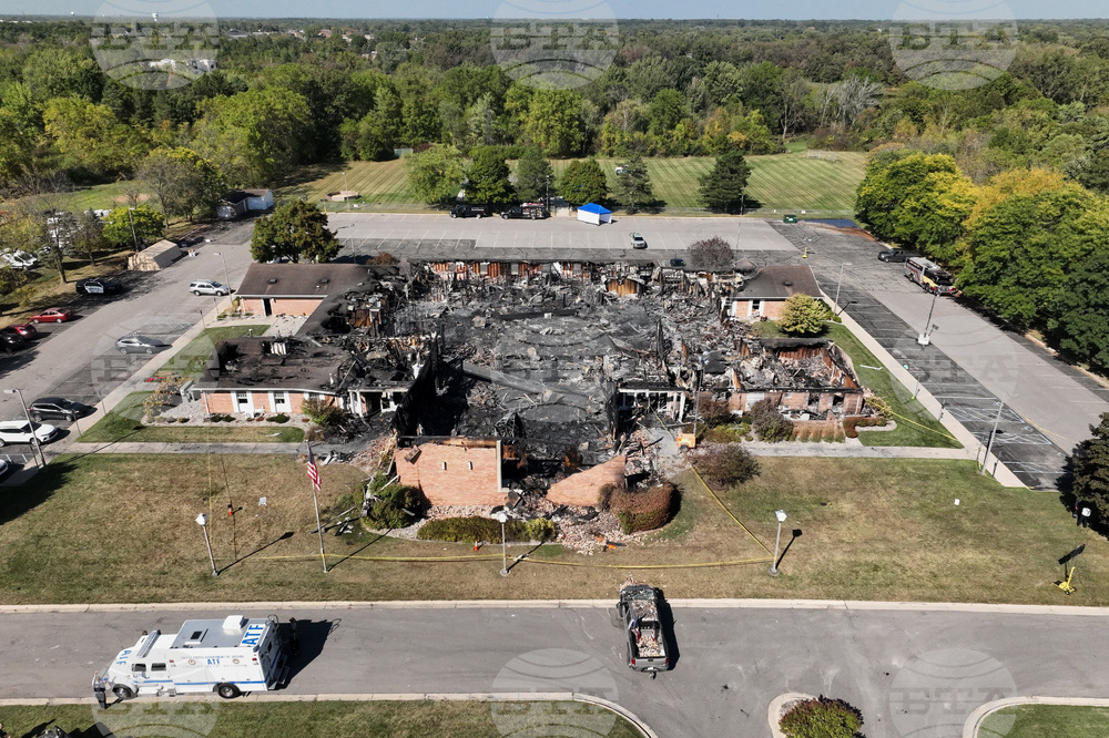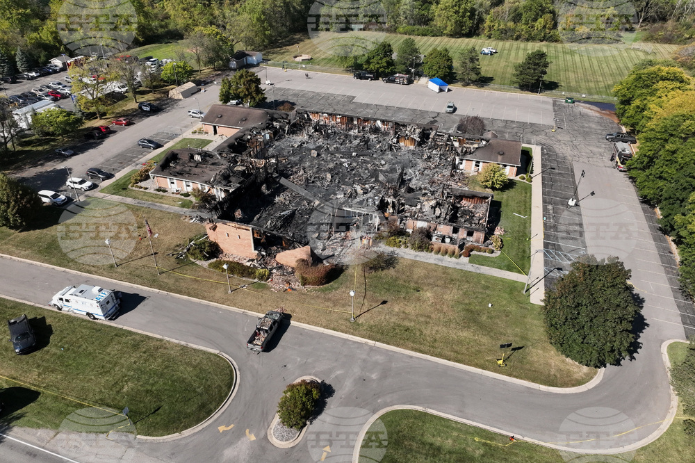 Investigators walk in front of The Church of Jesus Christ of Latter-day Saints in Grand Blanc Township, Mich., Monday, Sept. 29, 2025, after a man rammed his vehicle on Sunday into the building before opening fire and setting the building ablaze. (AP Photo/Ryan Sun)
