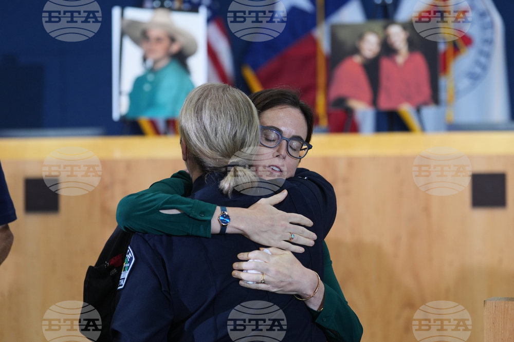 Travis County Attorney General's Office Mindy Montford, left, tries to hold back tears during a news conference regarding a breakthrough in the 1991 I Can't Believe It's Yogurt murder case, Monday, Sept. 29, 2025, in San Antonio. (AP Photo/Eric Gay)