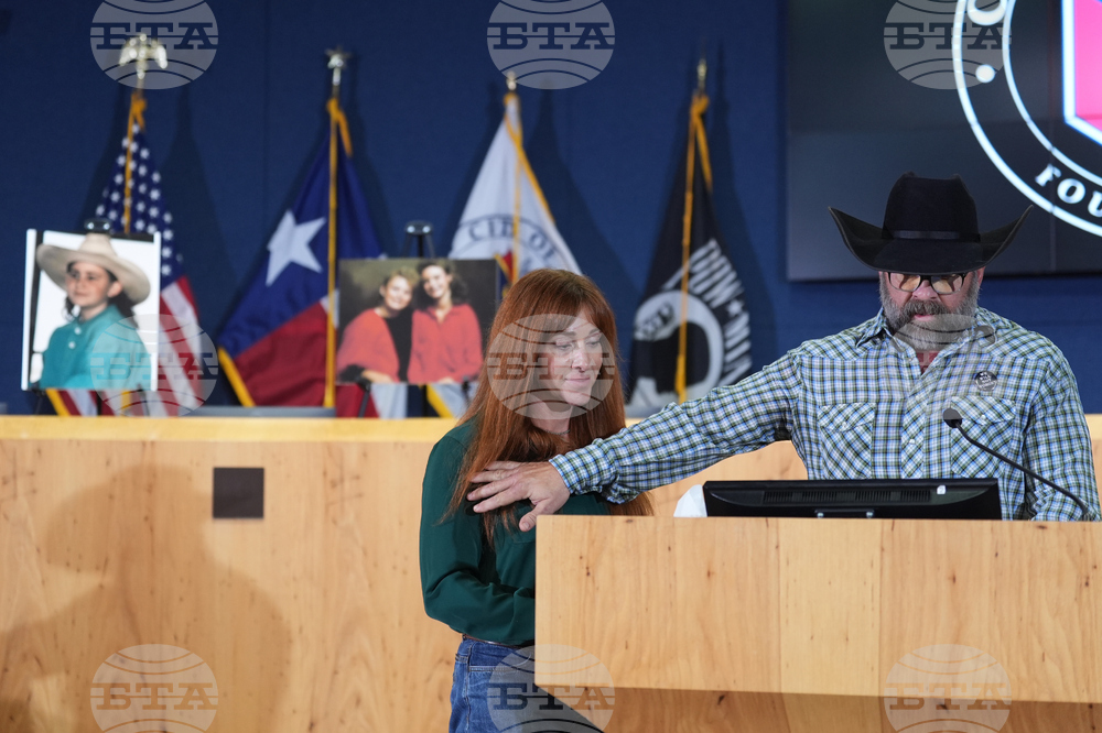 Angie and Shawn Ayers, sister-in-law and brother of victim Amy Ayers, join other family member during a news conference regarding a breakthrough in the 1991 I Can't Believe It's Yogurt murder case, Monday, Sept. 29, 2025, in San Antonio. (AP Photo/Eric Gay)