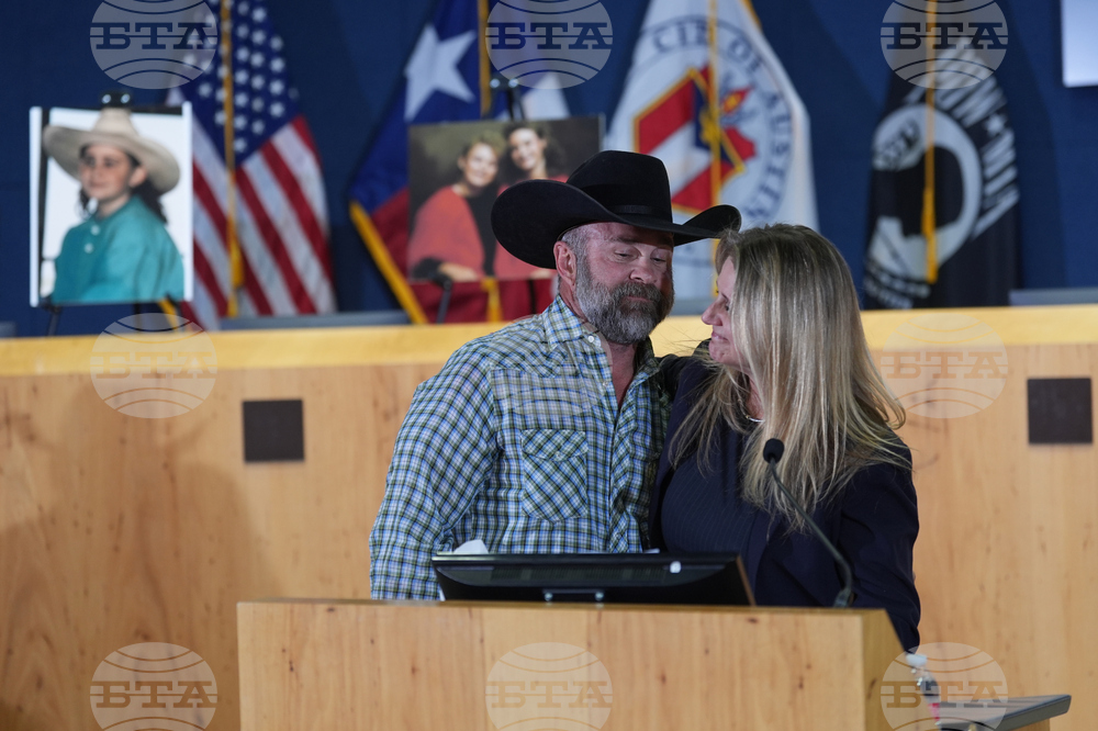Angie and Shawn Ayers, sister-in-law and brother of victim Amy Ayers, join other family member during a news conference regarding a breakthrough in the 1991 I Can't Believe It's Yogurt murder case, Monday, Sept. 29, 2025, in Austin, Texas. (AP Photo/Eric Gay)