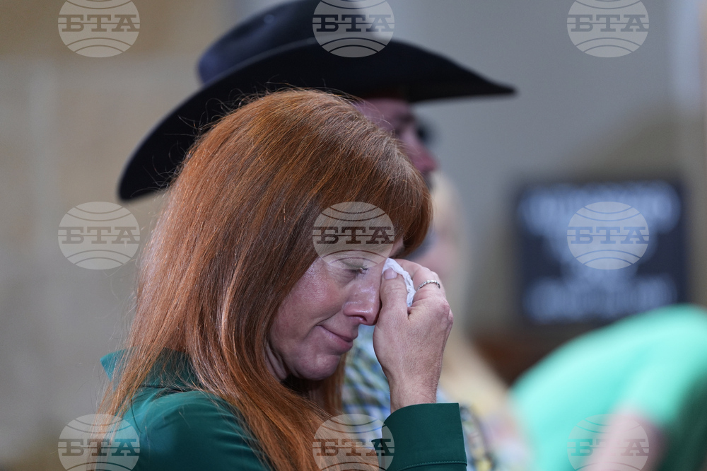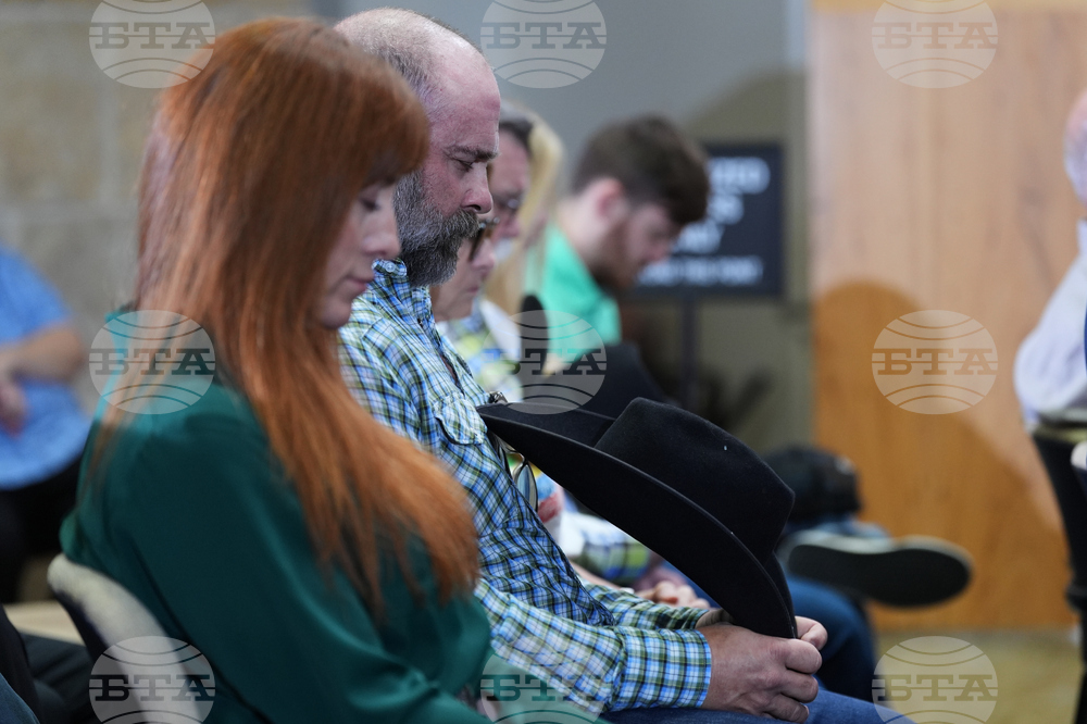 Angie and Shawn Ayers, sister-in-law and brother of victim Amy Ayers, join other family member for a movement of silence during a news conference regarding a breakthrough in the 1991 I Can't Believe It's Yogurt murder case, Monday, Sept. 29, 2025, in San Antonio. (AP Photo/Eric Gay)