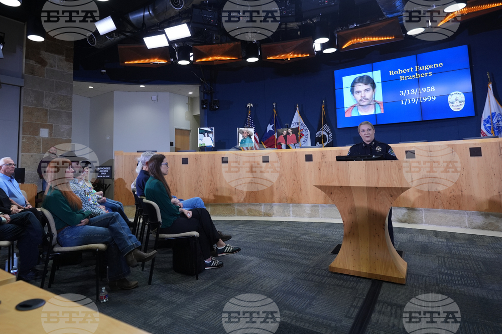 Austin Police Chief Lisa Davis, right, speaks during a news conference regarding a breakthrough in the 1991 I Can't Believe It's Yogurt murder case, Monday, Sept. 29, 2025, in San Antonio. (AP Photo/Eric Gay)